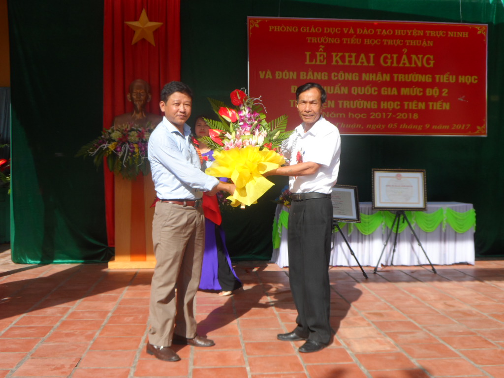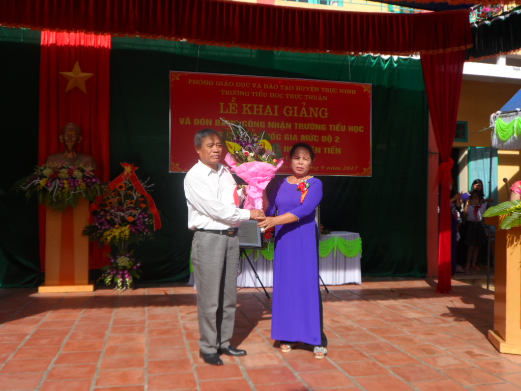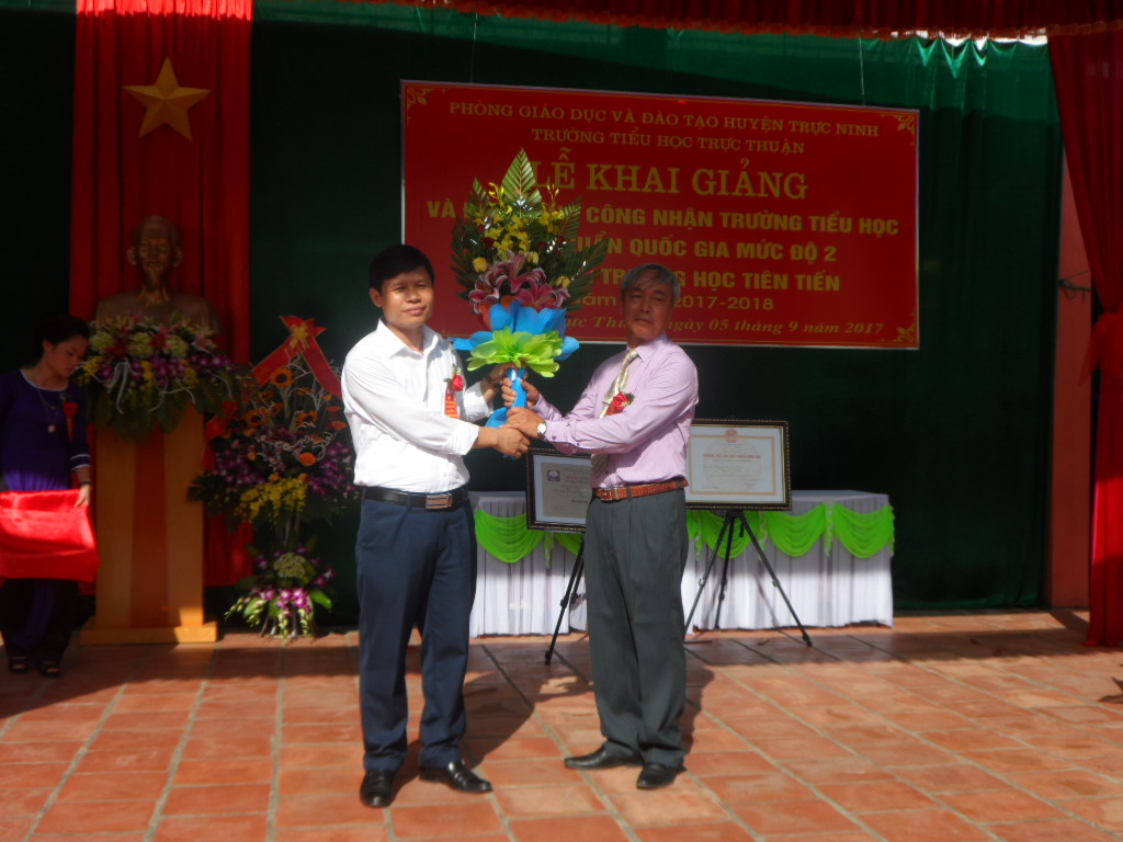 | Lãnh đạo UBND huyện và Phòng GD&ĐT huyện Trực Ninh (Nam Định) trao tặng Bằng công nhận trường tiểu học đạt chuẩn quốc gia mức độ 2, thư viện trường học tiên tiến cho Trường Tiểu học Trực Thuận. |