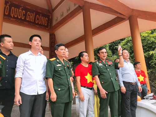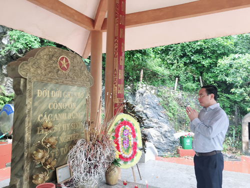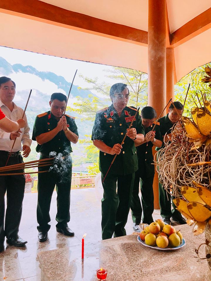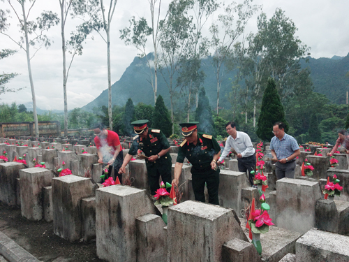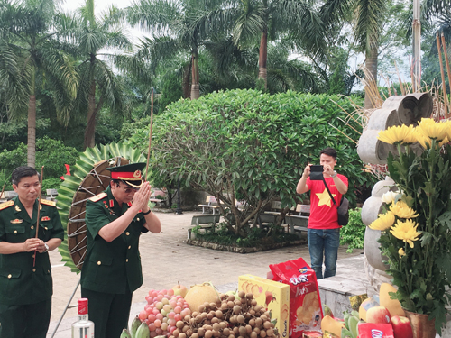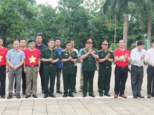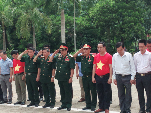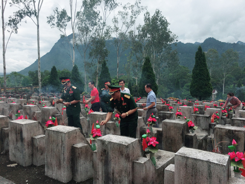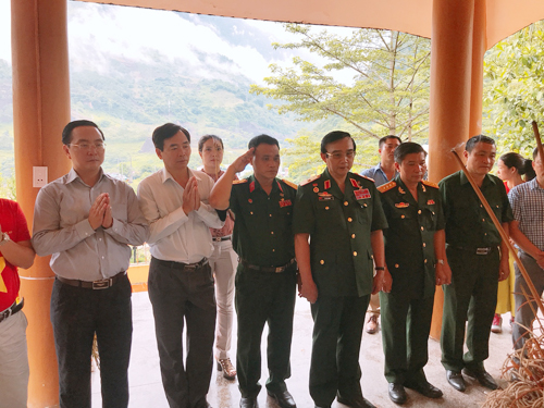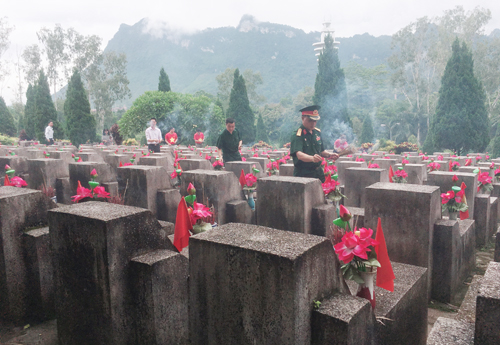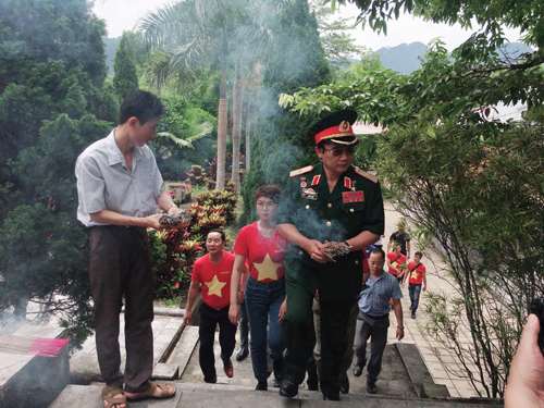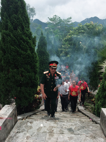 | Đoàn Công tác dẫn đầu là Thiếu tướng - Anh hùng LLVTND Lê Mã Lương tiến lên các phần mộ thắp hương cho các Anh hùng Liệt sĩ |