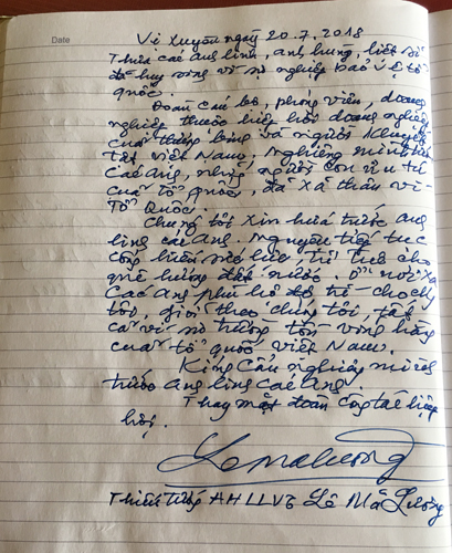 Thiếu tướng - Anh hùng LLVTND Lê Mã Lương viết vào Sổ lưu niệm của Nghĩa trang Vị Xuyên |