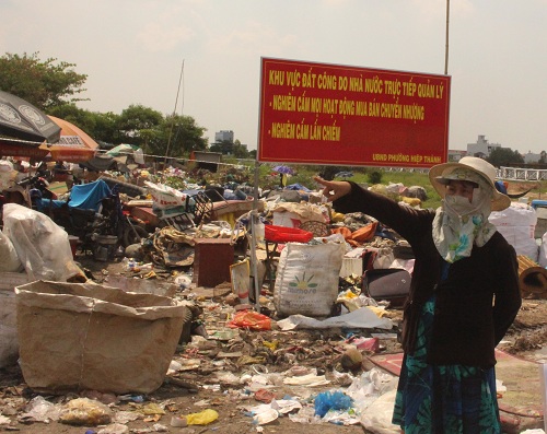 | Miếng đất gia đình bà đang chờ được cấp sổ đỏ hiện đã thành một bãi rác và có cắm biển đất công |