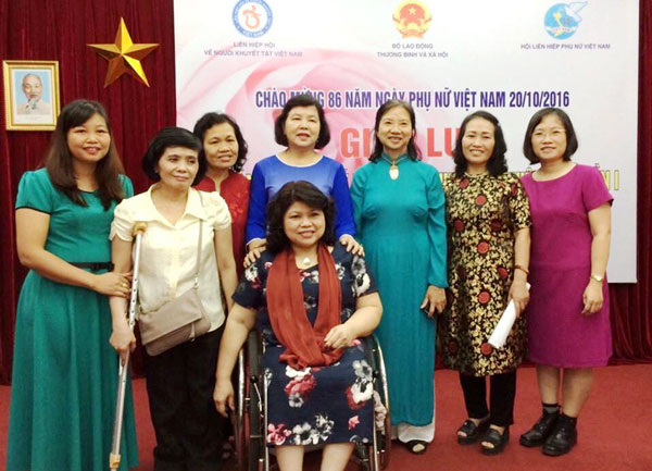 | Chị Đinh Thị Quỳnh Nga (ngoài cùng bên trái) trong một cuộc gặp gỡ giao lưu với những người khuyết tật khác do Bộ LĐ,TB&XH tổ chức. |