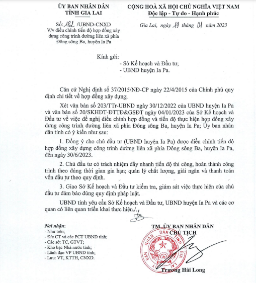 Chủ tịch UBND tỉnh Gia Lai Trương Hải Long ký Công văn số 182/UBND-CNXD ngày 19/1/2023 về việc điều chỉnh tiến độ hợp đồng xây dựng công trình đường liên xã phía Đông sông Ba, huyện Ia Pa.
