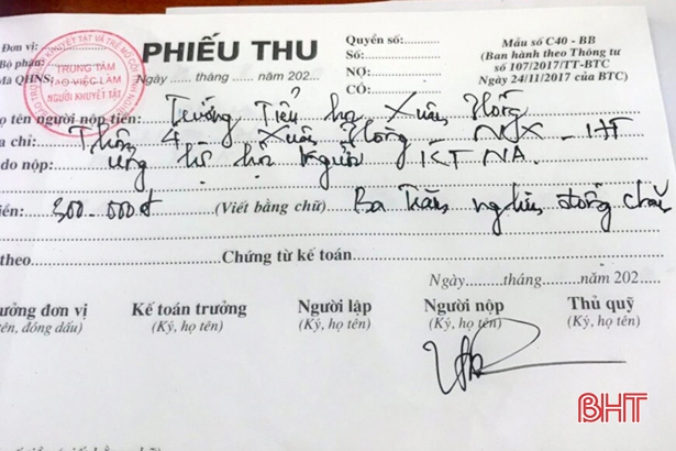 Tờ phiếu thu sau khi bán 30 bút bi với giá 300.000 đồng cho Trường Tiểu học Xuân Hồng.