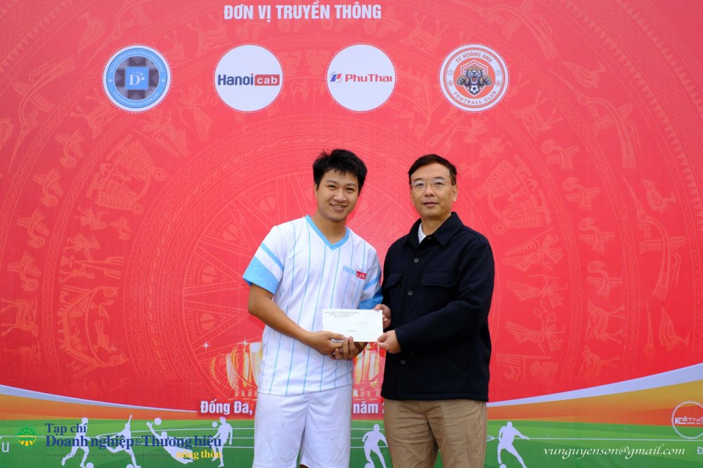 Đồng chí Vũ Mạnh Chiến, Quận ủy viên – Bí thư Đảng ủy khối doanh nghiệp quận Đống Đa trao giải " Vua phá lưới" cho cầu thủ Lê Anh Quang đến từ FC Truyền hình cáp Hà Nội.