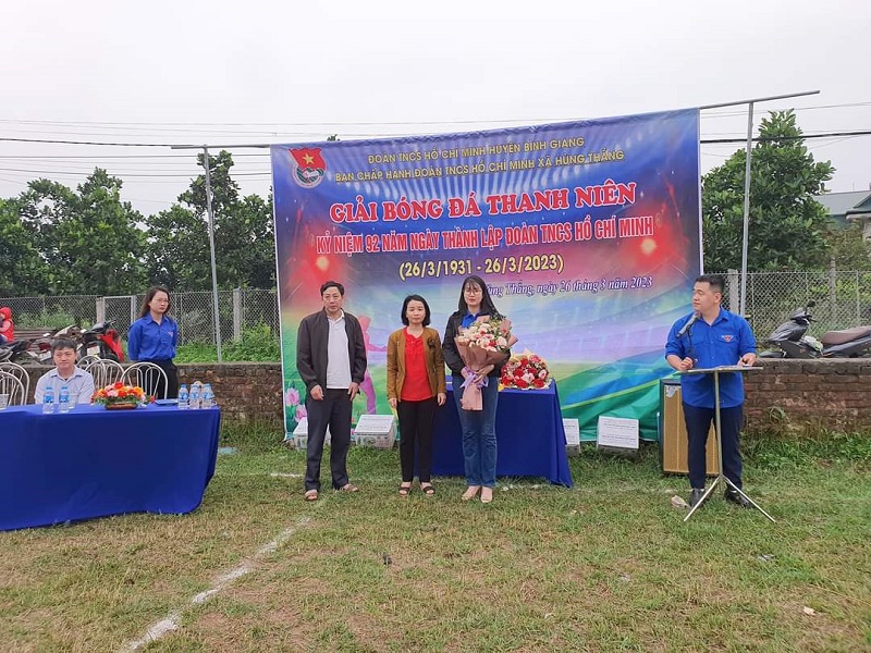 tặng hoa và động viên đoàn thanh niên xã tham dự giải bóng đá.
