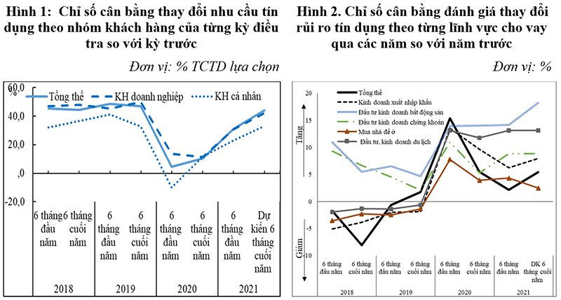 Theo nhận định của các TCTD, nhu cầu tín dụng tổng thể của khách hàng “tăng” trong 6 tháng đầu năm 2021 và dự báo tiếp tục “tăng” trong 6 tháng cuối năm và cả năm 2021 ở tất cả các đối tượng, loại tiền, kỳ hạn và lĩnh vực. Chỉ duy nhất nhu cầu tín dụng cho đầu tư, kinh doanh du lịch ghi nhận “giảm” trong 6 tháng đầu năm 2021 và được dự báo phục hồi nhẹ trong 6 tháng cuối năm 2021.