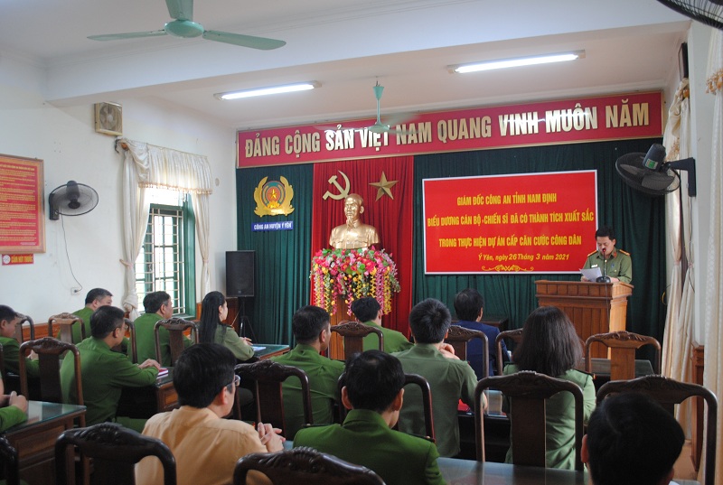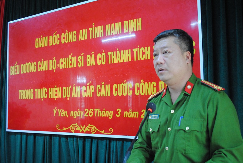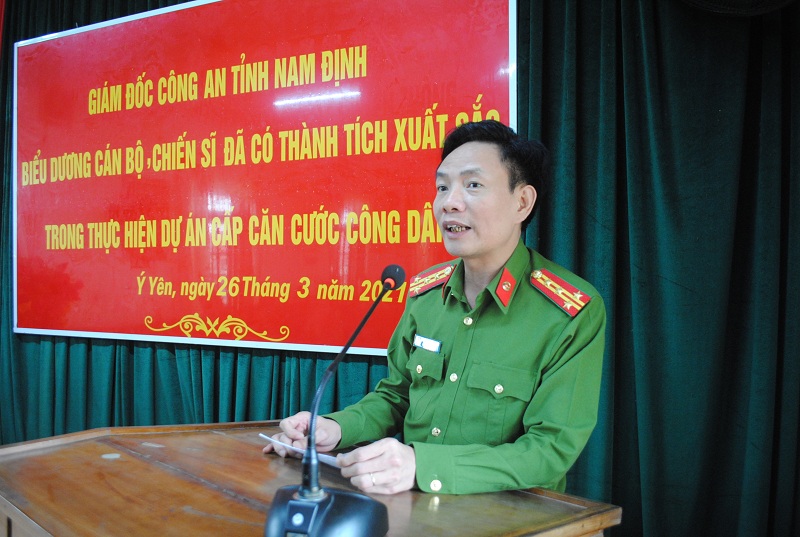 Phát biểu ý kiến chúc mừng Công An huyện, đồng chí Phó giám đốc Công An tỉnh Nam Định đã ghi nhận và đánh giá cao những nỗ lực cố gắng của cán bộ chiến sỹ lực lượng Công An huyện trong thực hiện nhiệm vụ trên các mặt công tác, đặc biệt là tiến độ cấp CCCD trong thời gian qua. Đồng thời yêu cầu trong thời gian tới, công an huyện Ý Yên phát huy kết quả đạt được, chủ động khắc phục khó khăn, đoàn kết nỗ lực xây dựng lực lượng vững mạnh toàn diện từng bước đáp ứng yêu cầu nhiệm vụ trong tình hình mới. Ý Yên là huyện có dân số, diện tích lớn trong tỉnh, do vậy việc cấp CCCD gặp nhiều khó khăn, lực lượng quản lý và cấp CCCD huyện Ý Yên cần nỗ lực phấn đấu hoàn thành và hoàn thành vượt mức tiến độ, chỉ tiêu cấp CCCD, góp phần vào thành tích chung của Công an Nam Định trong cấp CCCD mà Bộ Công An giao.