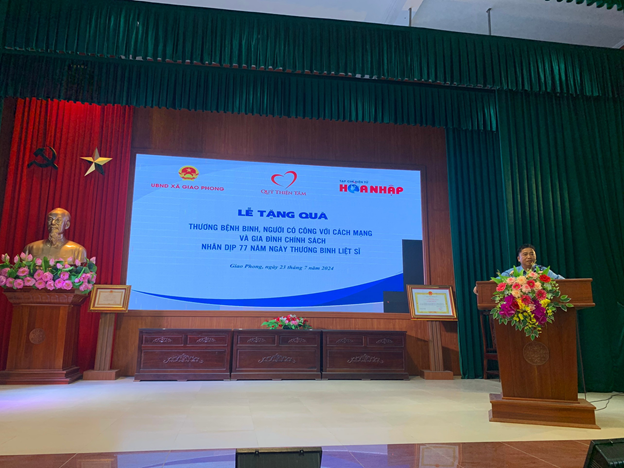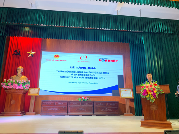 Phát biểu tại buổi lễ, Ông Nguyễn Ngọc Quyết – Tổng biên tập Tạp chí Điện tử Hoà nhập cho biết việc tổ chức tri ân, tặng quà các gia đình thân nhân liệt sĩ, thương bệnh binh và người có công với cách mạng nhân dịp kỷ niệm Ngày Thương binh - Liệt sỹ 27/7 hàng năm là một hoạt động mang đậm nét nhân văn, có ý nghĩa giá trị thiết thực và mang tính giáo dục truyền thống cách mạng sâu sắc, thể hiện đạo lý “Uống nước nhớ nguồn”, “Đền ơn đáp nghĩa”. Kỷ niệm 77 năm, Ngày Thương binh liệt sĩ, nhằm bày tỏ lòng biết ơn sâu sắc đối với những Anh hùng Liệt sĩ hy sinh thân mình giữ vững ngọn cờ Tổ quốc, Tạp chí Điện tử Hòa nhập (Hoanhap.vn) đã lên kế hoạch trao quà tại nhiều địa phương trong cả nước, trong đó có tỉnh Nam Định. Trong buổi lễ, Tạp chí đã phối hợp với UBND xã Giao Phong để trao 104 phần quà cho các thương bệnh binh, người có công với cách mạng.