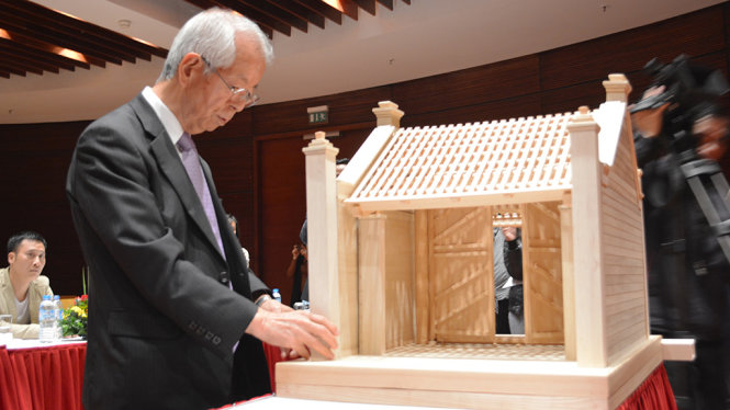 | Giáo sư, kiến trúc sư Ejima Akiyoshi giới thiệu và hoàn thành công đoạn lắp mô hình. (Ảnh: Internet) |