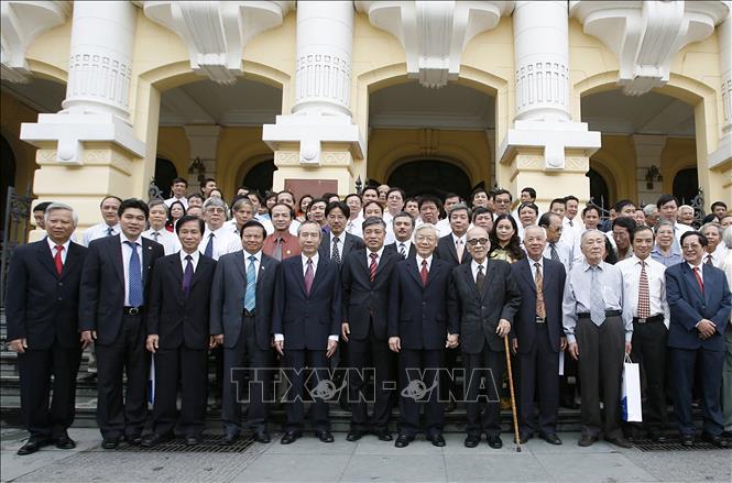 Chủ tịch Quốc hội Nguyễn Phú Trọng chụp ảnh chung với Giáo sư Vũ Khiêu (chống gậy) và các thế hệ cán bộ, phóng viên, biên tập viên Thông tấn xã Việt Nam, tại lễ kỷ niệm 65 năm ngày thành lập TTXVN (15/9/1945 - 15/9/2010). Ảnh: Trí Dũng/TTXVN