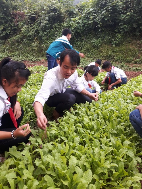 | Thầy Ngọc cùng các em học sinh chăm sóc vườn rau của nhà trường để cải thiện bữa ăn hàng ngày |