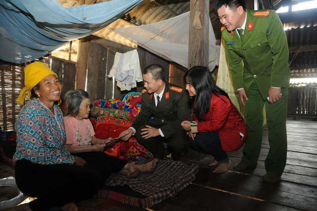 Đại diện báo Công an Nhân dân, Công ty Văn Phú – Invest và chính quyền địa phương tới nhà thăm mẹ liệt sỹ Hà Thị Cầu.