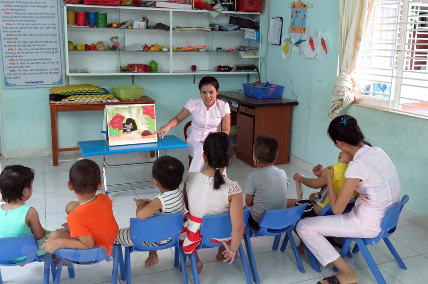 Trẻ tự kỷ tại Trung tâm Thiên Thần nhỏ (phường Đông Thành, thành phố Ninh Bình) được giáo viên chăm sóc, dạy dỗ, giúp trẻ sớm hòa nhập cộng đồng. (Ảnh: Hải Yến/TTXVN)