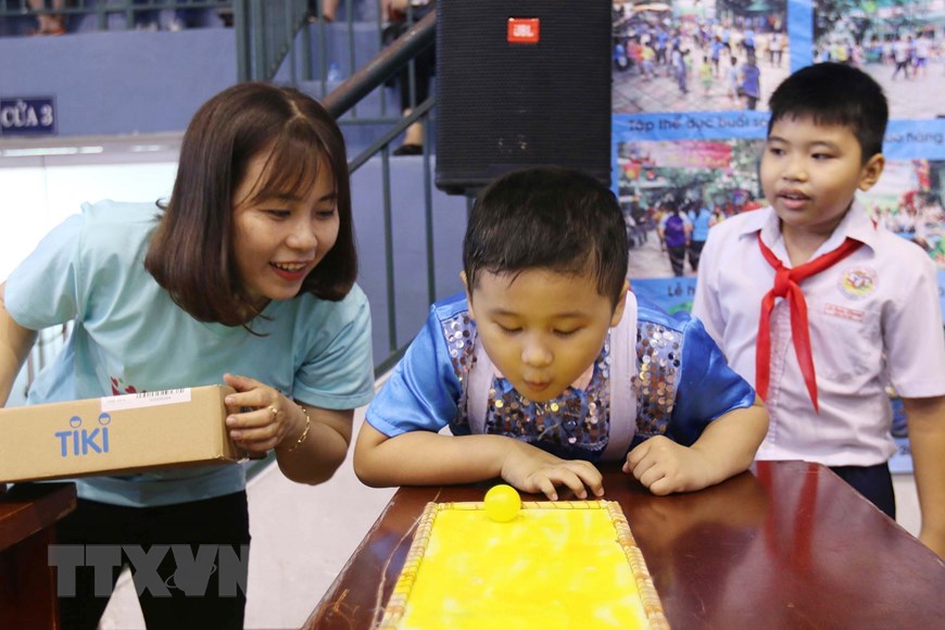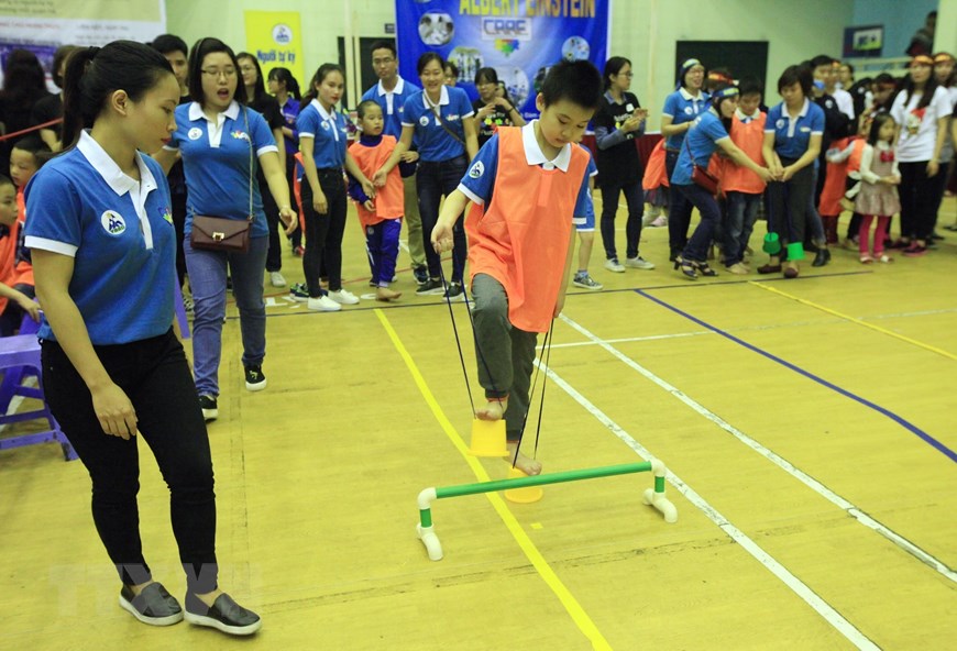 Chương trình thể thao thân thiện giúp trẻ tự kỷ hòa nhập cộng đồng tại Ngày Việt Nam nhận thức tự kỷ lần thứ ba (1/4/2018). (Ảnh: Thanh Thương/TTXVN)