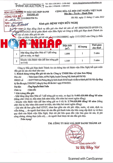 Ngày 11/11/2022 Công ty Đấu giá hợp danh Thành An đã tổ chức đấu giá thành công tài sản cho thuê của Bệnh viện Hữu Nghị là: Mặt bằng tầng hầm nhà số 7 và khuôn viên Bệnh viện để cung cấp dịch vụ trông giữ xe. Tuy nhiên, qua tìm kiếm thông tin trên cổng thông tin điện tử quốc gia về đấu giá tài sản (https://dgts.moj.gov.vn/) trong thời gian qua, chúng tôi không tìm thấy thông tin công khai việc đấu giá trên để đăng ký tham gia đấu giá. .
