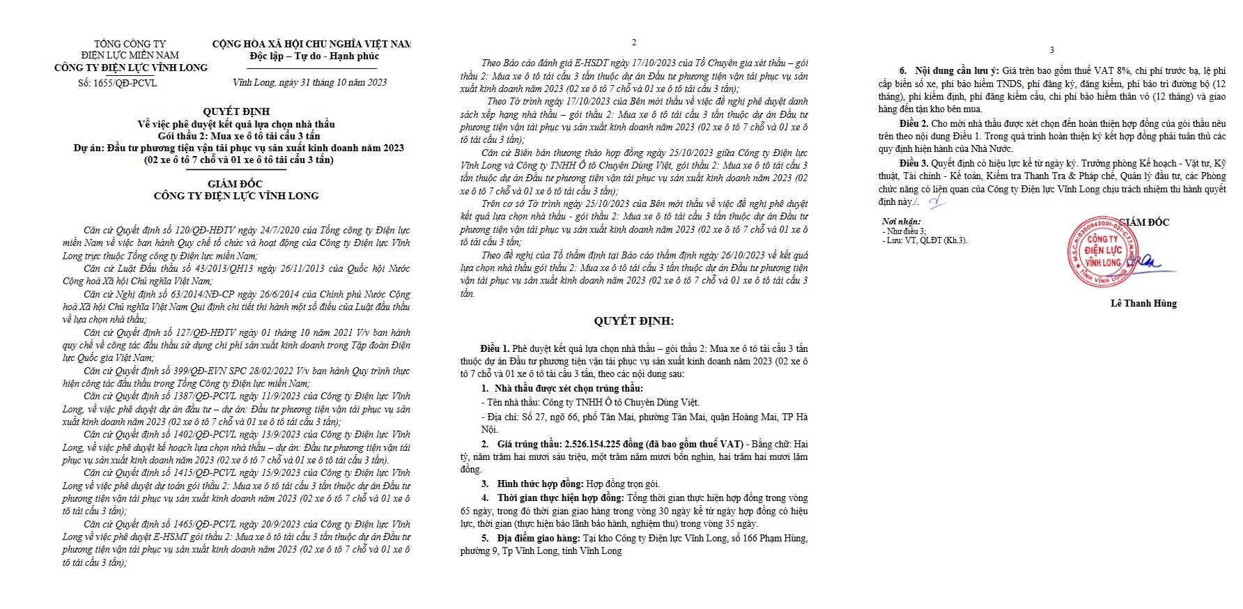Tại gói thầu “Mua xe ô tô tải cẩu 3 tấn” mã thông báo mời thầu IB2300229828 có giá gói thầu 2.737.017.000 VND với nguồn vốn là Vốn vay tín dụng thương mại và vốn ĐTXD năm 2023 Tổng công ty Điện lực miền Nam cấp cho Công ty Điện lực Vĩnh Long, một mình Công Ty TNHH Ô Tô Chuyên Dùng gia đấu thầu và đã trúng thầu với giá 2.526.154.225 VND. Tuy nhiên mặt hàng trong gói thầu lại có giá cao hơn nhiều so với các mặt hàng ở trong gói thầu khác ở các đơn vị khác.