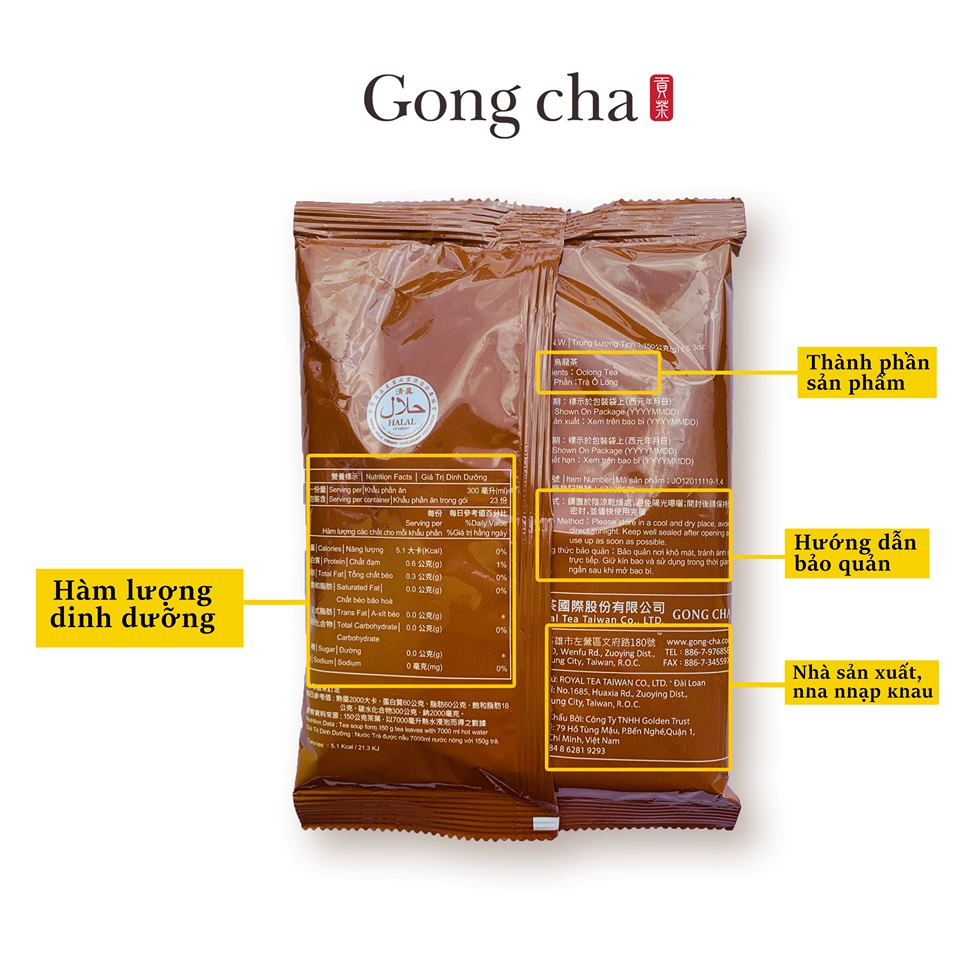 Ảnh bao bì nguyên liệu thực tế đang sử dụng tại Gong Cha Việt Nam có đầy đủ thông tin bằng tiếng Việt.