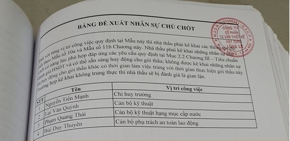 Cụ thể, Công ty CP tư vấn thiết kế xây dựng Lũng Lô đã cùng sử dụng hồ sơ nhân sự Phạm Quang Thái – Cán bộ kỹ thuật hạng mục cấp nước để đi dự thầu. Doanh nghiệp này cũng dùng hồ sơ của các công nhân: Nguyễn Văn Hải, Phạm Minh Tuấn, Nguyễn Duy Quyết, Nguyễn Công Tiến, Hà Văn Quyền, Đỗ Văn Lực, Đoàn Hữu Quang, Hồ Thị Mùi, Hồ Hữu Hà, Nguyễn Đình Hiệu, Hồ Đức Nghĩa, Đỗ Văn Mạnh, Phạm Thành Đô, Hoàng Văn Cường, Phạm Văn Nghĩa, Nguyễn Thế Hoàng để dự thầu ở cả 2 gói thầu.