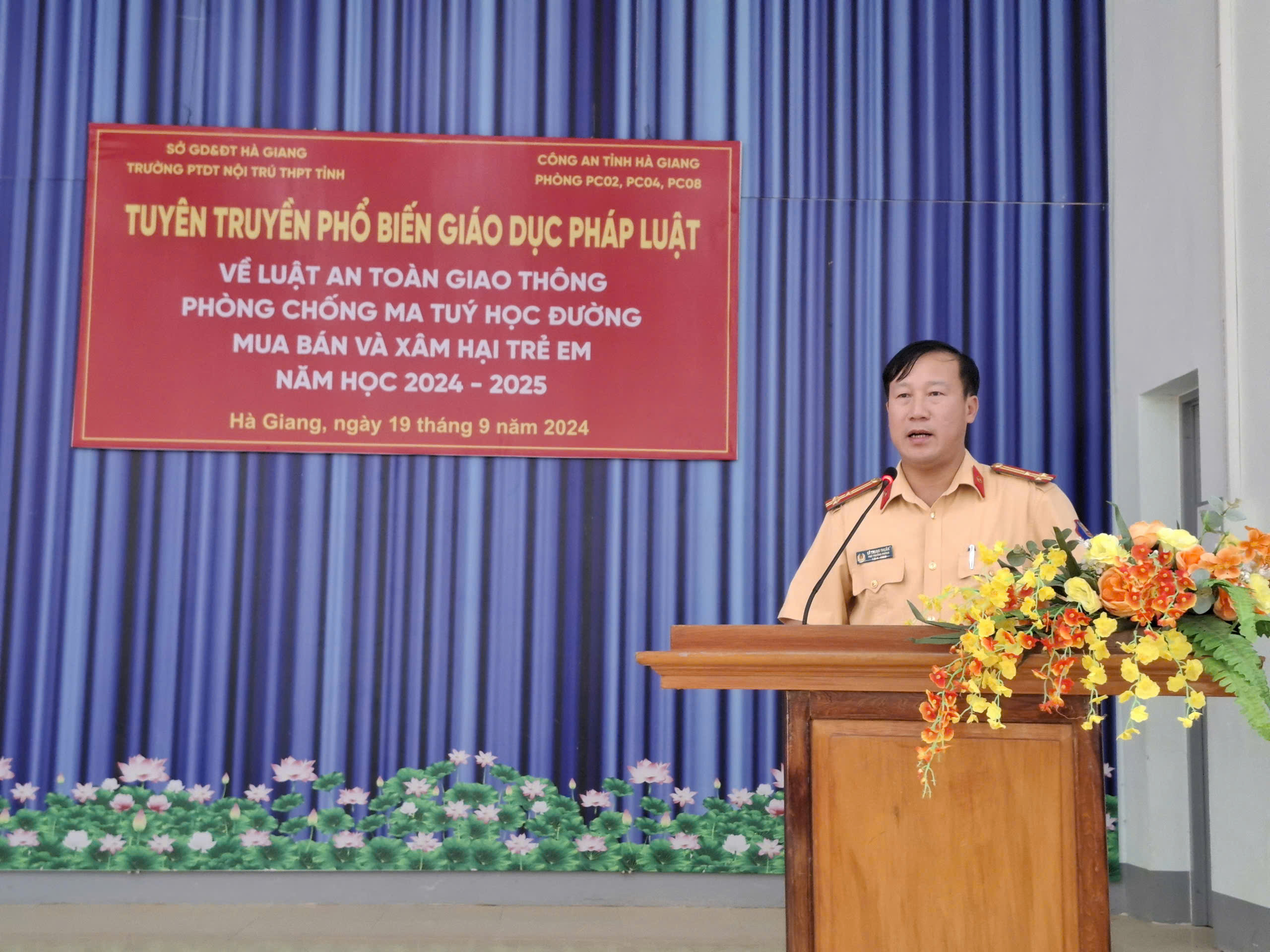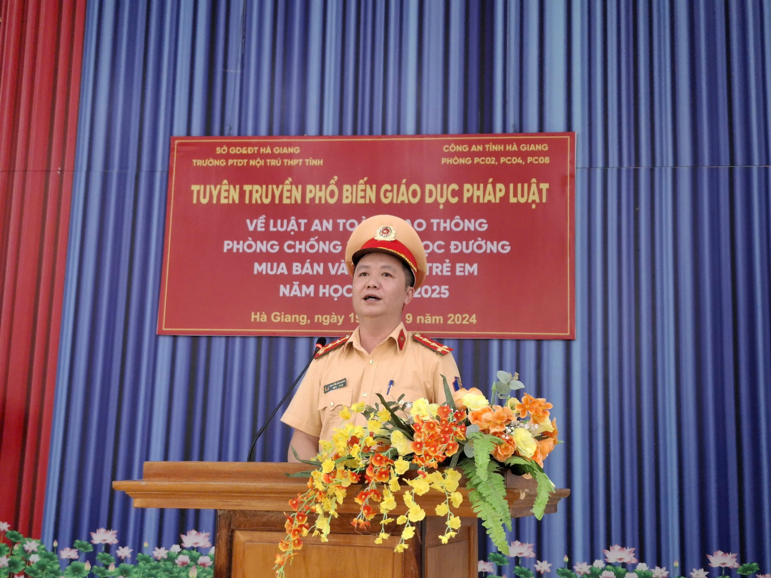 Thượng tá Lê Trung Thuần (Phó trưởng phòng CSGT Công an tỉnh Hà Giang) phát biểu trong buổi tuyên truyền giáo dục Luật giao thông đường bộ cho các em học sinh trong trường PTDT nội trú THPT tỉnh Hà Giang.