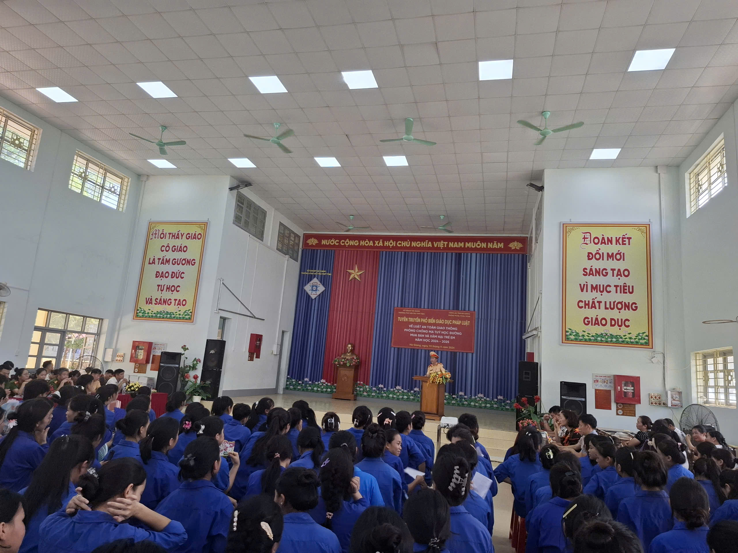 Đội 2 Phòng CSGT Công an tỉnh Hà Giang phối hợp với Trường PTDT nội trú THPT tỉnh Hà Giang tổ chức buổi tuyên truyền, giáo dục Luật an toàn giao thông đường bộ cho các em học sinh và các cán bộ, giáo viên trong trường.