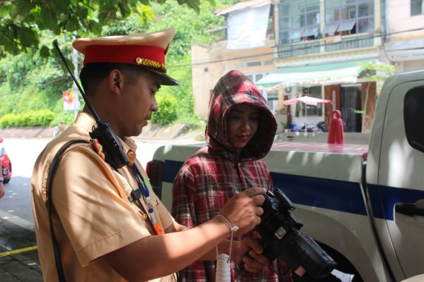 Quá trình làm nhiệm vụ, ngoài lực lượng công khai cắm chốt trên đường, tổ công tác của Đội CSGT - TT Công an thành phố Hà Giang đã bố trí một chiến sĩ CSGT sử dụng thiết bị chuyên dụng đo tốc độ các phương tiện lưu thông trên đường. Từ thông tin thiết bị đo được, các trường hợp vi phạm sẽ được gửi về chốt kiểm soát của CSGT trên đường để tiến hành dừng xe, xử phạt các tài xế chạy quá tốc độ.