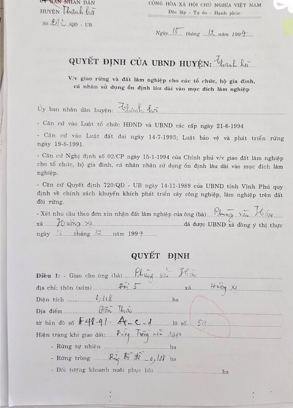 Bên cạnh đó, việc Tòa án sơ thẩm căn cứ Biên bản giao đất và Quyết định giao đất số 292 ngày 15/12/1994 của UBND huyện Thanh Hòa (nay là huyện Hạ Hòa) thì lô đất mà ông Phùng Văn Hậu được giao là tờ bản đồ F 48.91 A-c-1, thuộc lô 59 lại có dấu hiệu sửa chữa tên (“Sáu” sang “Hậu”), đồng thời ghi nhận quyền sử dụng đất có diện tích 3.543,2m2 nhưng không xác định được vị trí lô, thửa đất nào cho ông Hậu?