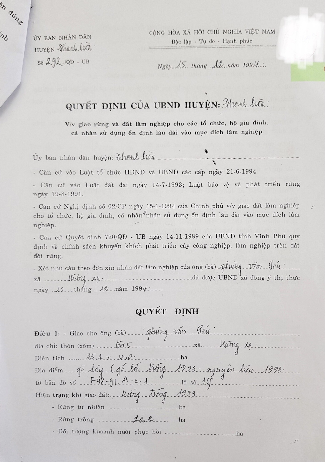 Được biết, năm 1994 ông Phùng Đức Sáu (khu 5, xã Hương Xạ, huyện Hạ Hòa, tỉnh Phú Thọ), được Lâm trường Thanh Hòa (nay là Kiểm lâm huyện Hạ Hòa) giao 08 lô đất (từ lô số 4 đến lô số 11), với diện tích 25,1ha đất để trồng rừng phòng hộ và bảo vệ rừng; đồng thời giao khoán 01 lô đất số 18 với diện tích 3,3ha là đất 50 năm nhưng hợp đồng giao khoán là trồng rừng và cây gỗ lớn. Khi mới nhận tất cả đều là đất trống đồi trọc, nhưng đến nay khu rừng phòng hộ do ông Sáu trồng, quản lý và bảo vệ đã lên xanh.