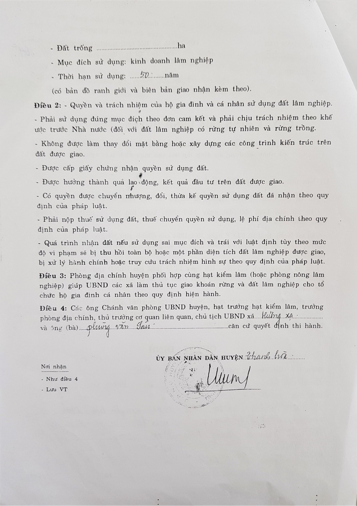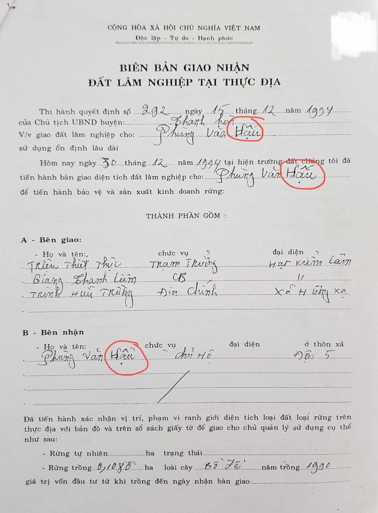 Cũng tại Biên bản và Quyết định cấp đất này trùng với Quyết định 292 ngày 15/12/1994 của UBND huyện Thanh Hòa cấp cho ông Phùng Văn Sáu 29,2ha, là lô 19. Ngoài ra ông Sáu cho rằng, không có chính sách cấp đất nào của UBND huyện thời kỳ đó. Đây là dấu hiệu của sự giả mạo hồ sơ và bản thân ông Sáu không được ký vào biên bản nhận đất nào của huyện giao mà toàn bộ là do Lâm trường Thanh Hòa cùng Ủy ban hành chính xã Hương Xạ thời đó giao theo chính sách giao đất lâm nghiệp trồng rừng… nêu trên