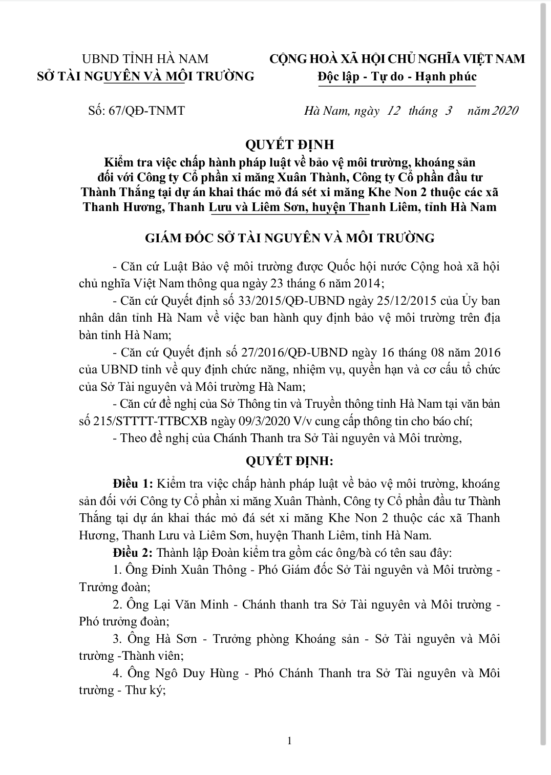 Theo đó, ngày 12/3, Sở Tài nguyên và Môi trường tỉnh Hà Nam đã có quyết định số 67/QĐ-TNMT, do ông Nguyễn Văn Hảo - Phó Giám đốc Sở ký ban hành về việc chấp hành pháp luật về bảo vệ môi trường, khoáng sản đối với Công ty Công ty Cổ phần xi măng Xuân Thành, Công ty Cổ phần đầu tư Thành Thắng.
