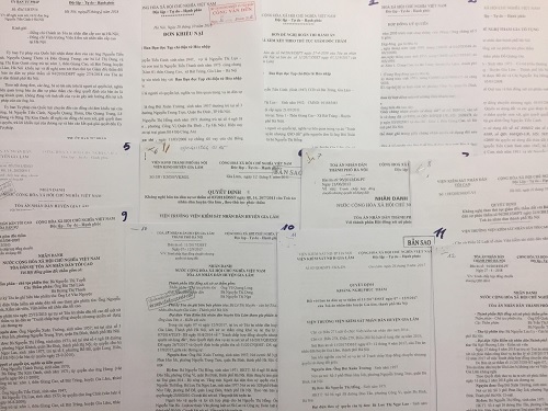 Hồ sơ gồm có: 1) Đơn Khiếu nại gửi Ban bạn đọc; 2) Hợp đồng ủy quyền lập ngày 5/5/2018 giữa ông Nguyễn Tiến Cảnh và bà Nguyễn Thị Hồng (kèm theo giấy giao tiền); 3) Đơn đề nghị tham gia tố tụng của ông Nguyễn Tiến Thanh ngày 23/4/2018 (có hộ khẩu photo kèm theo); 4) CV số 1311/UBTP14 ngày 25/6/2018 của Ủy ban Tư pháp Quốc hội khóa XIV; 5) Biên bản giao nhận tài liệu ngày 23/4/2018 của TAND Hà Nội; 6) Giấy biên nhận đơn đề nghị của công dân số 706/TACC-BNĐ ngày 4/7/2018 của TAND cấp cao tại Hà Nội; 7) CV số 402/CV-TANDCC ngày 02/7/2018 của TAND cấp cao tại Hà; 8) Bản án sơ thẩm số 03/2011 ngày 08,14,20/7/2011 của TAND huyện Gia Lâm; 9) Quyết định số 398/KNDS/VKSGL ngày 12/8/2011 của Viện KSND huyện Gia Lâm về việc kháng nghị bản án dân sự sơ thẩm số 03/2011/DSST; 10) Bản án số 96/2012/DS-PT ngày 21/06/2012 của TAND TP. Hà Nội; 11) Quyết định số 118/QĐKNGĐT-V5 ngày 22/10/2013 của Viện KSND tối cao về việc kháng nghị theo thủ tục giám đốc thẩm đối với Bản án dân sự phúc thẩm số 96/2012/DS-PT; 12) Quyết định số 607/2013/DS-GĐT ngày 25/12/2013 của Tòa Dân sự TANDTC; 13) Bản án số 11/2017/DSST ngày 07+12/9/2017 của TAND huyện Gia Lâm; 14) Quyết định số 03/QĐKNPT-VKS- DS ngày 26/9/2017 của Viện KSND huyện Gia Lâm; 15) Bản án số 94/2018/DS-PT ngày 27/4/2018 của TAND TP. Hà Nội.