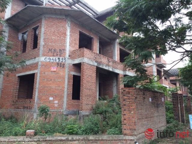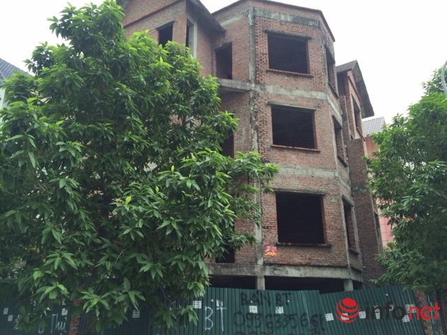 Hầu hết các biệt thự chưa hoàn thiện đều được treo thông tin bán cùng số điện thoại liên hệ. Ảnh: Minh Thư