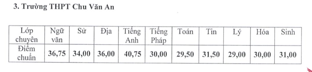 | Điểm chuẩn trúng tuyển vào lớp 10 Trường THPT Chu Văn An |