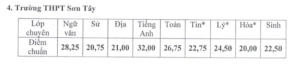 | Điểm chuẩn trúng tuyển vào lớp 10 Trường THPT Sơn Tây. |