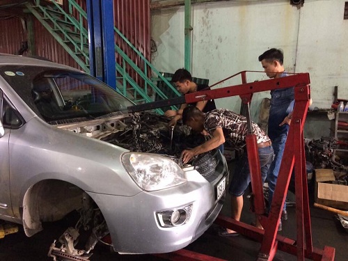 Chiếc xe của anh Cường đang bị tháo tung tại gara ô tô Mạnh Sơn.