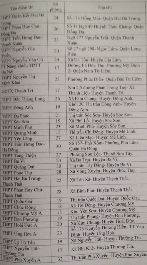 Các điểm thi tại 18 trường phổ thông, cụ thể như sau: