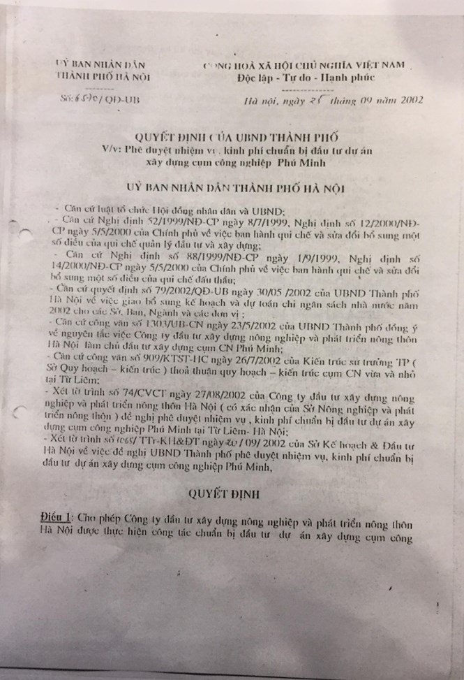 Việc thực hiện nghiên cứu, thỏa thuận quy hoạch, lập báo cáo nghiên cứu khả thi đã được các sở, ban, ngành của Thành phố Hà Nội thẩm định và ủng hộ dự án tại các văn bản số 1664/TĐ-XD ngày 06/12/2002 của Sở Xây dựng, văn bản số 476/QĐ/SNN-KH ngày 16/12/2002, số 91/QĐ/SNN-KH ngày 21/3/2003 của Sở NN&PTNT. Từ những văn bản trên, các doanh nghiệp thuê đất hình thành nên Cụm công nghiệp Phú Minh ngày nay đã mạnh dạn đầu tư, chấp nhận rủi ro để vay vốn ngân hàng, xây dựng cơ sở vật chất, máy móc, trang thiết bị lên tới hàng trăm tỷ đồng, với mong muốn gắn bó lâu dài với khu đất để ổn định sản xuất kinh doanh.