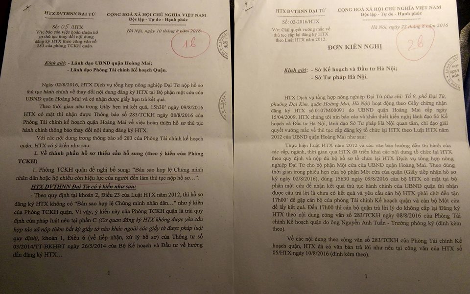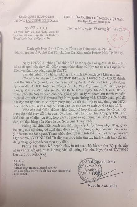 Lý do mà quận Hoàng Mai chưa cấp lại đăng ký HTX cho HTX DVTHNN Đại Từ rất vô lý, thể hiện tại Văn bản số 308/TCKH do ông Nguyễn Anh Tuấn, Trưởng phòng Tài chính kế hoạch quận Hoàng Mai ký ngày 19/8/2016, với nội dung: Việc cấp đổi Giấy chứng nhận đăng ký HTX, trong đó có nội dung đề nghị thay đổi liên quan đến thành viên là pháp nhân Công ty TNHH có khí chế tạo và dịch vụ tổng hợp 27/7 có một số nội dung phải xin ý kiến hướng dẫn, chỉ đạo bằng văn bản của các Sở, ngành thành phố Hà Nội. Phòng Tài chính kế hoạch tạm thời chưa cấp Giấy chứng nhận đăng ký và bổ sung các nội dung đề nghị thay đổi vào hồ sơ đăng ký HTX. Sau khi có ý kiến của Sở ngành Thành phố, phòng Tài chính kế hoạch sẽ thông báo cho HTX DVTHNN Đại Từ tiếp tục thực hiện thủ tục hành chính thay đổi nội dung đăng ký HTX theo quy định.