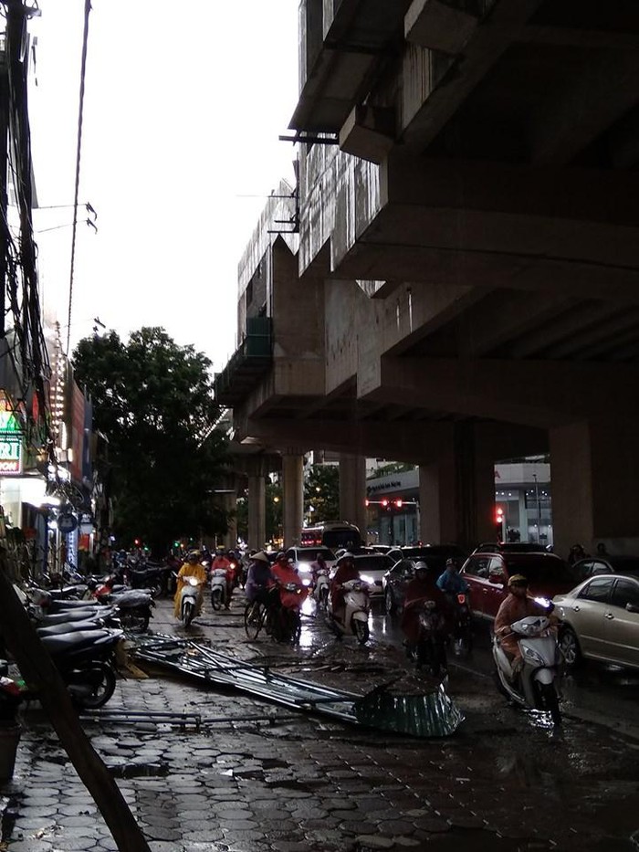 Giàn giáo đường sắt trên cao đổ trong gió trên phố Cầu Giấy. Ảnh: FB Thiên Lương (OFFB)