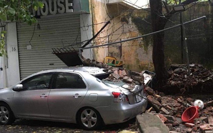 Tường đổ đè lên xe ô tô để ven đường trên phố Vạn Bảo - Hà Nội.Ảnh: Nguyễn Sơn/VTC News