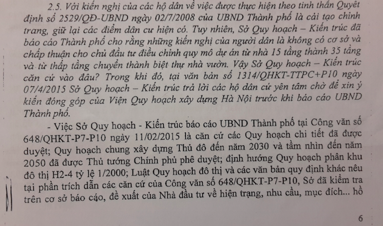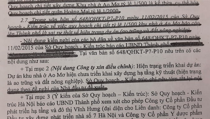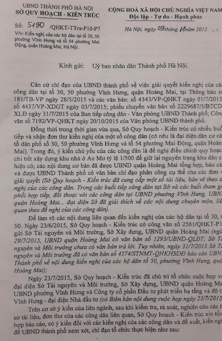 Trước tình trạng khiếu kiện phức tạp, kéo dài của người dân cho rằng Sở Quy hoạch - Kiến trúc đã báo cáo UBND TP.Hà Nội sai sự thật, ngày 28/5/2015, UBND TP.Hà Nội đã có Thông báo số 181/TB-VP giao cho Sở Quy hoạch - Kiến trúc rà soát, trả lời kiến nghị của các hộ dân tổ 30 phường Vĩnh Hưng. Sau gần nửa năm “nhào nặn” câu chữ, ngày 9/11/2015, Sở Quy hoạch - Kiến trúc Hà Nội đã ra Văn bản số 5190/QHKT-TTra-P7-P10 báo cáo UBND TP.Hà Nội, đồng thời thay trả lời kiến nghị của các hộ dân tổ 30 phường Vĩnh Hưng.