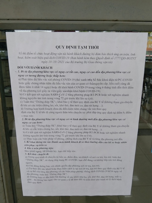 Bến xe thực hiện công tác đảm bảo thích ứng an toàn, linh hoạt, kiểm soát dịch bệnh Covid-19 được tổ chức chặt chẽ tại khu vực bến xe. Hành khách khi đến bến xe phải quyét mã QR, khai báo y tế trung thực và đảm bảo các yêu cầu như tiêm đủ liều Vắc xin, có kết quả xét nghiệm PCR, tuân thủ nghiêm thông điệp 5k của Bộ Y tế, kê khai thông tin vào danh sách hành khách đi xe theo hướng dẫn của lái xe, chủ động thông báo cho chính quyền địa phương nơi cư trú, tự theo dõi sức khỏe hoặc thực hiện cách ly tại nơi cư trú theo quy định, trường hợp có dấu hiệu bất thường về sức khỏe như: Ho, sốt, rát họng, mất vị giác... thì thông báo ngay cho cơ quan y tế để được theo dõi và xử lý dịch bệnh theo đúng quy định.