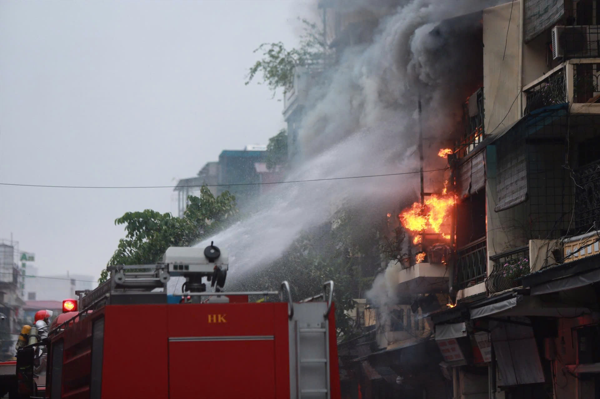 Lực lượng chức năng đang cố gắng khống chế và dập tắt một đám cháy lớn tại phố Hàng Ngang, Hoàn Kiếm, Hà Nội. (Ảnh CTV)