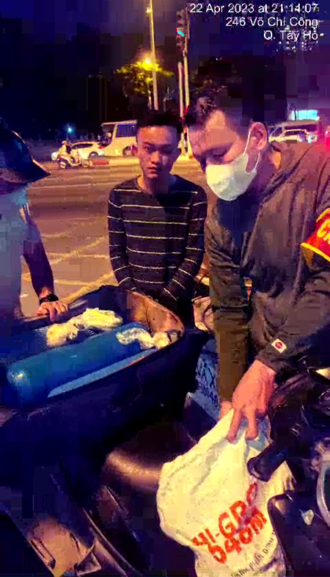 Ghi nhận của phóng viên Hòa Nhập (Hoanhap.vn) đêm 22/4, tổ công tác Y12/141 do Trung tá Nguyễn Anh Tuấn ( Phó đội trưởng đội CSGT đường bộ số 14) làm tổ trưởng thực hiện nhiệm vụ hóa trang tuần tra trên địa bàn quận Tây Hồ. Khoảng 21h15 đêm cùng ngày, Tổ công tác Y12/141 trong lúc tuần tra, làm nhiệm vụ tại khu vực ngã 4 Võ Chí Công - Xuân La (Hướng Võ Chí Công đi cầu Nhật tân) đã phát hiện tài xế là Phan Thế T (SN 2001, HKTT: huyện Kỳ Sơn, tỉnh Hòa Bình) đi xe BKS: 88S3-59.xx có biểu hiện nghi vấn nên đã dừng xe, kiểm tra hành chính.