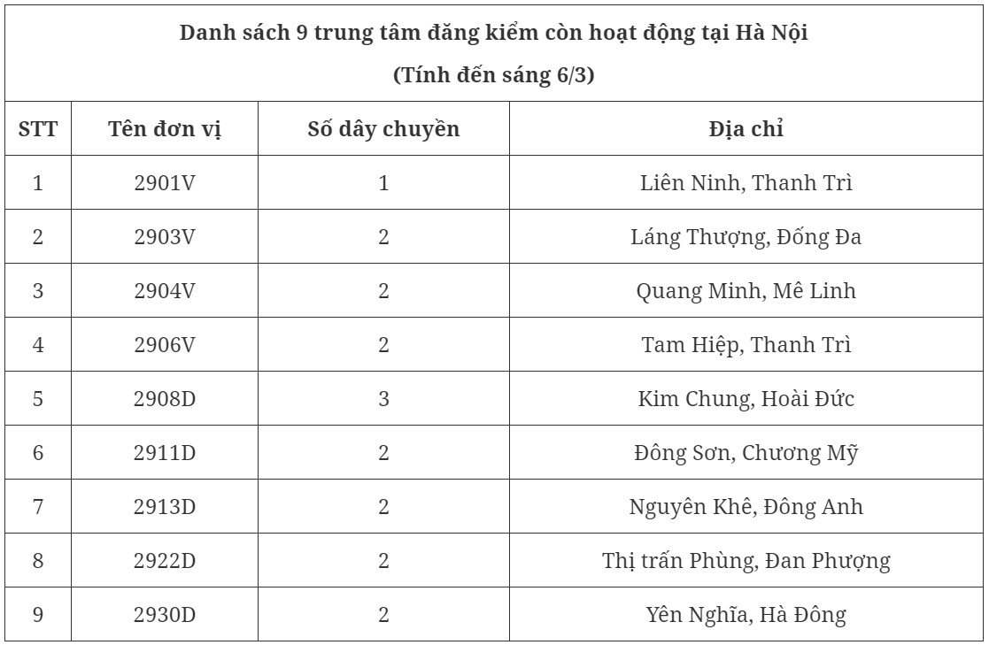 Như vậy, đến thời điểm hiện tại, Hà Nội chỉ còn 9/31 Trung tâm đăng kiểm đang còn hoạt động.