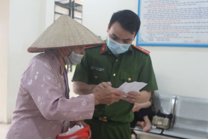 Cán bộ chiến sĩ Công an huyện Mê Linh hướng dẫn người dân vào làm thủ tục cấp thẻ căn cước công dân.