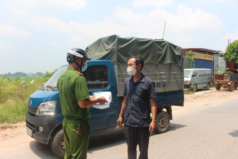 Đại úy Nguyễn Quang Hưng (Đội CSGT -TT Công an huyện Sóc Sơn) cho biết: Tổ tuần tra kiểm soát lưu động số 5 tuần tra, xử phạt vi phạm quy định phòng chống dịch 6 xã gồm xã Phú Minh, xã Mai Đình, xã Phù Lỗ, xã Đông Xuân, xã Xuân Thu, xã Kim Lũ. Tổ tuần tra số 5 gồm 3 cán bộ Công an huyện phối hợp với lực lượng công an 6 xã để tuần tra,xử phạt vi phạm quy định phòng chống dịch.