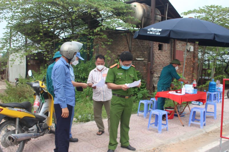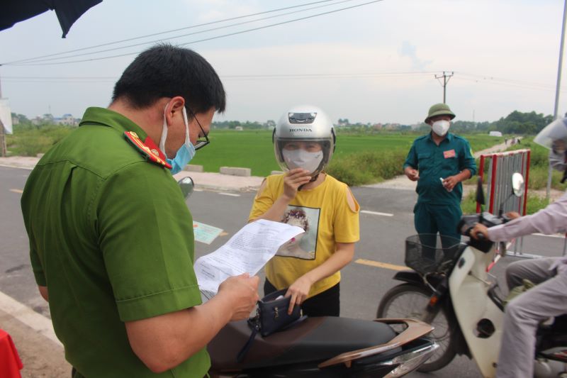 Tại một chốt thuộc xã Đông Xuân (Sóc Sơn) lực lượng Công an xã kiểm tra giấy tờ công nhân khu công nghiệp đi làm về.