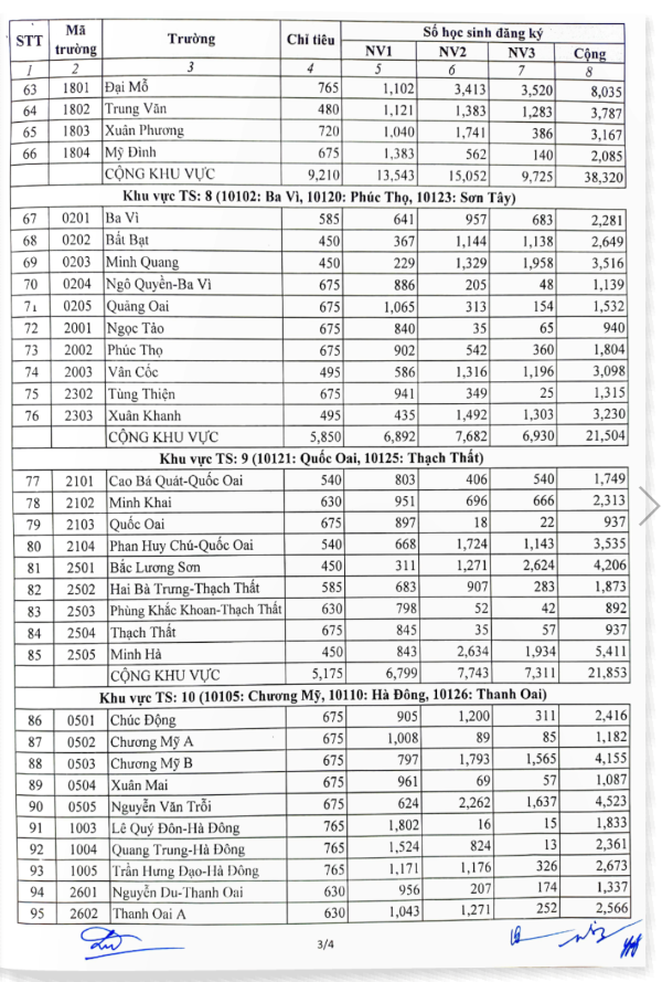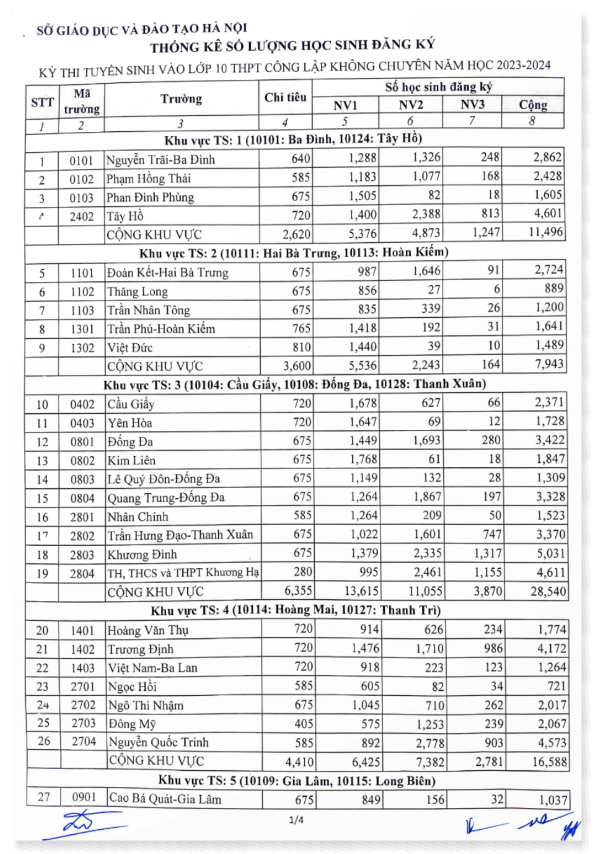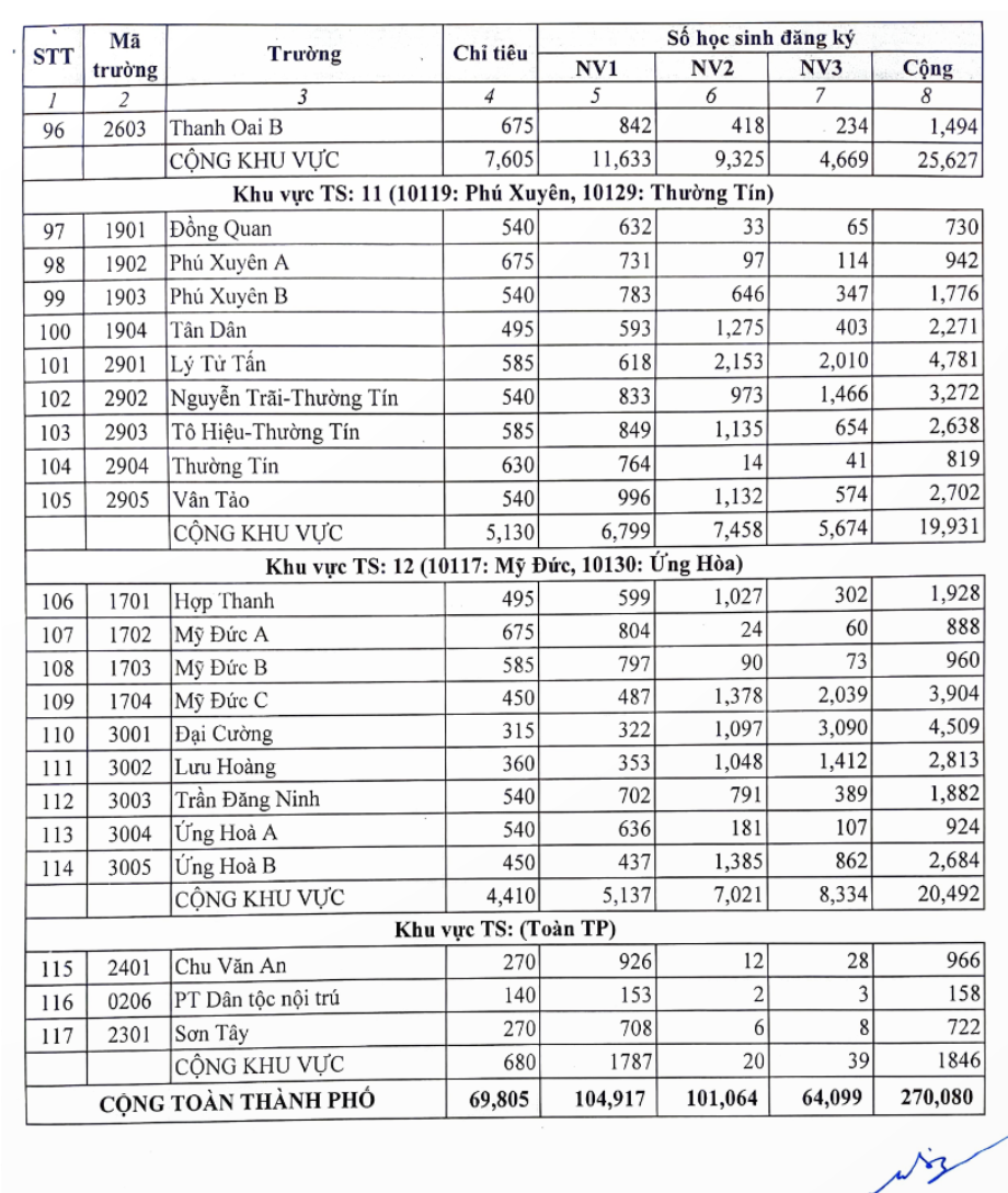 Ngày 17/5, Sở Giáo dục và Đào tạo Hà Nội công bố số lượng học sinh đăng ký dự tuyển vào lớp 10 của từng trường trung học phổ thông công lập đại trà và chuyên năm học 2023-2024. Theo đó, có 104.917 thí sinh đăng ký nguyện vọng 1, số nguyện vọng 2 và 3 là hơn 101.000 và 64.000.