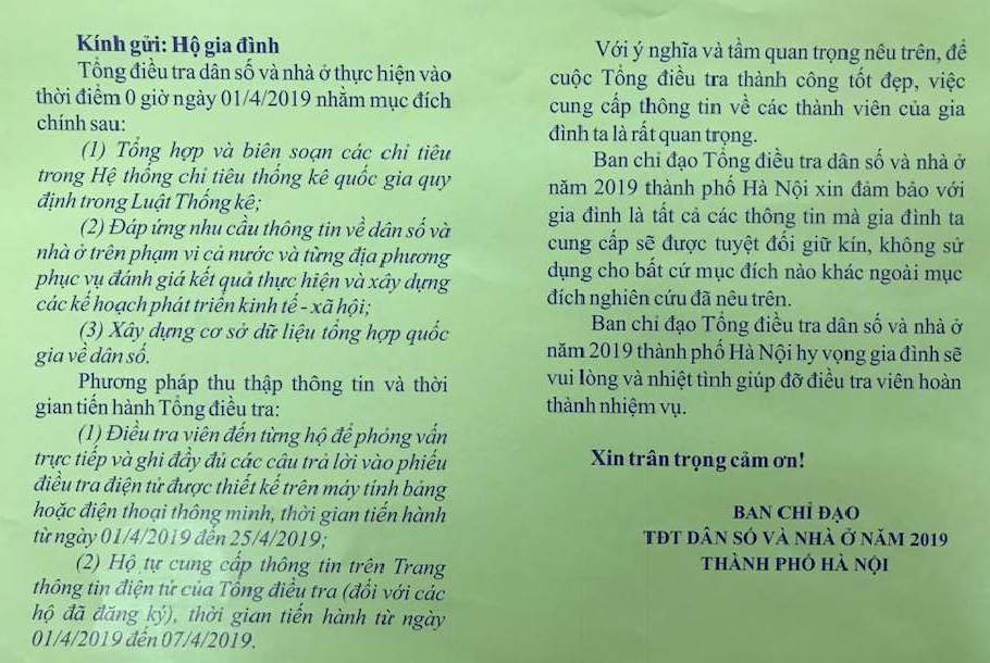 Được biết, để cuộc Tổng điều tra thành công tốt đẹp, Ban Chỉ đạo Tổng điều tra dân số nhà ở thành phố Hà Nội đã có thư gửi tới từng hộ gia đình về Tổng điều tra dân số và nhà ở năm 2019.