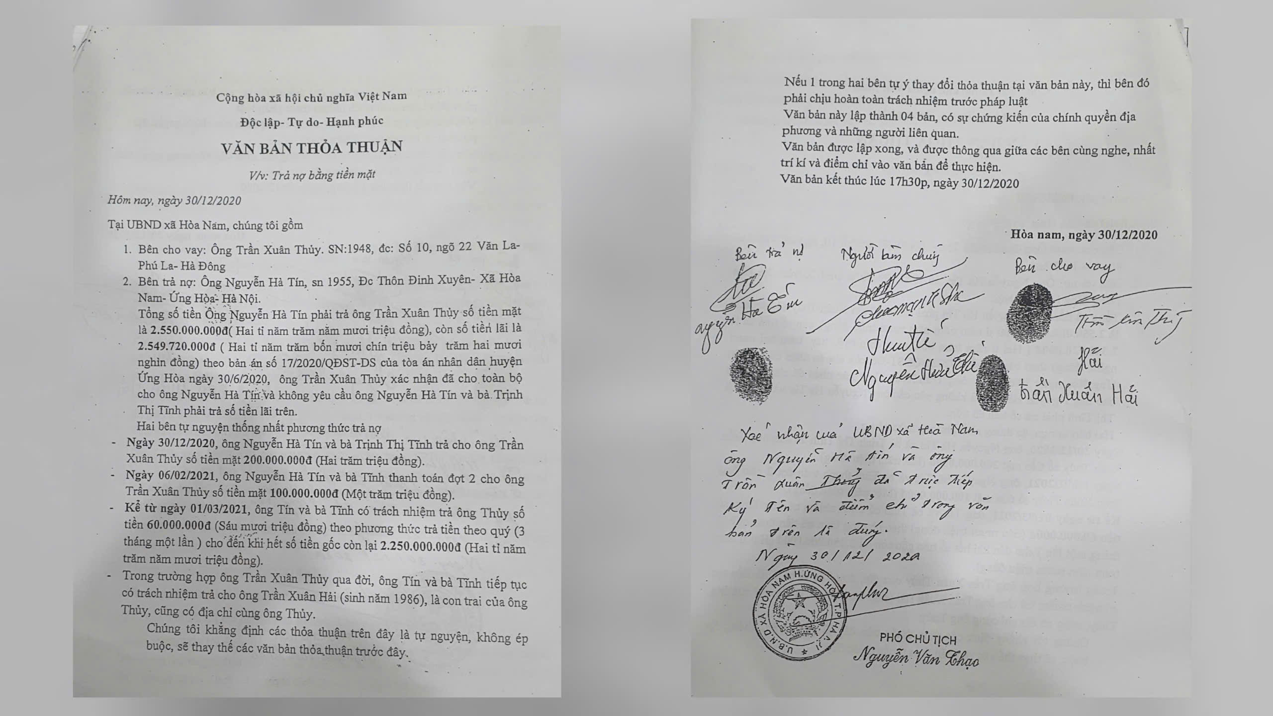 Ngày 30/12/2020, tại UBND xã Hòa Nam, Ứng Hòa, Hà Nội, căn cứ Quyết định số 17/2020/QĐST-DS của Tòa án Nhân dân huyện Ứng Hòa, Hà Nội, 2 bên tiếp tục tự nguyện thống nhất phương thức trả nợ. Theo đó: - Ngày 30/12/2020, ông Nguyễn Hà Tín và bà Trịnh Thị Tĩnh phải có nghĩa vụ trả ông Trần Xuân Thủy và bà Trịnh Thị Ngào số tiền mặt 200.000.000đ (Hai trăm triệu đồng); - Ngày 6/2/2021, ông Nguyễn Hà Tín và bà Trịnh Thị Tĩnh phải có nghĩa vụ trả ông Trần Xuân Thủy và bà Trịnh Thị Ngào số tiền mặt 100.000.000đ (Một trăm triệu đồng); - Kể từ ngày 1/3/2021, ông Nguyễn Hà Tín và bà Trịnh Thị Tĩnh phải có nghĩa vụ trả ông Trần Xuân Thủy và bà Trịnh Thị Ngào số tiền mặt 60.000.000đ (Sáu mươi triệu đồng) theo phương thức trả tiền theo quý, cho đến khi hết số tiền gốc còn lại 2.250.000.000đ (Hải tỷ hai trăm năm mươi triệu đồng). Trong trường hợp ông Trần Xuân Thủy qua đời, ông Tín, bà Tĩnh tiếp tục có trách nhiệm trả cho ông Trần Xuân Hải (sinh năm 1986), là con trai ông Trần Xuân Thủy, có cùng địa chỉ cùng ông Thủy.